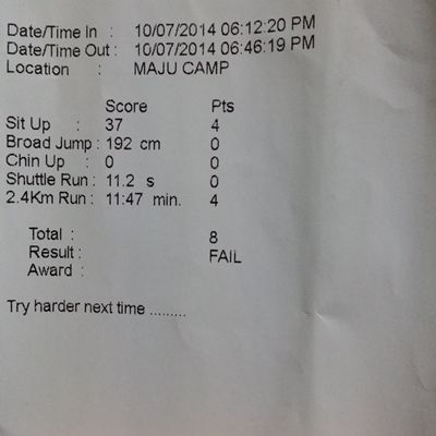 Moving on to IPPT. Again, I stressed that with some more training, getting silver for my IPPT isn't impossible anymore. For now, pass with incentive shouldn't be a problem, so I can wait to get $200 le! YZ said that if only they retain the static stations and remove the 2.4 km run, because he can pass all the static stations and the run takes up most of the time in IPPT. But he also noted that he always pass with borderline results, meaning there is high probability that he could not clear in one attempt, need to come back another time to clear all. But with this new IPPT, I think he could pass it without thinking too much. RT is taking up too much of our time le. IMO, even people like Shi Hao or SK can pass without much difficulty now le.
