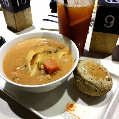 Had lunch at Soup Spoon. 好健康的午餐啊,全部都超低卡路里的。First time having a meal there lo, ordered a regular-sized SG Chicken & Mushroom Ragout and Swiss Cheese with Sweet Onion Jam to make up a set meal. Ok la, soup not bad and the onion jam used in the sandwich... Yes, according to Joa, it's something not everybody can accept. For me is ok leh...
