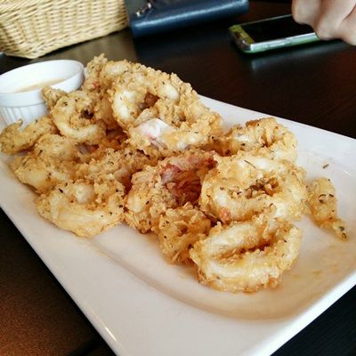 Went to Ice Edge Cafe @ Kovan for lunch with Joa and Barry. This is my first time here ds. Ordered Fish 'n' Chips ($14.80), Calamari Fritti ($12.80) and Bacon & Ham Aglio Olio Spaghetti ($14.80). Aglio Olio and fish 'n' chips got one-for-one offer. So me and Joa had the spaghetti while Barry had the fish 'n' chips.